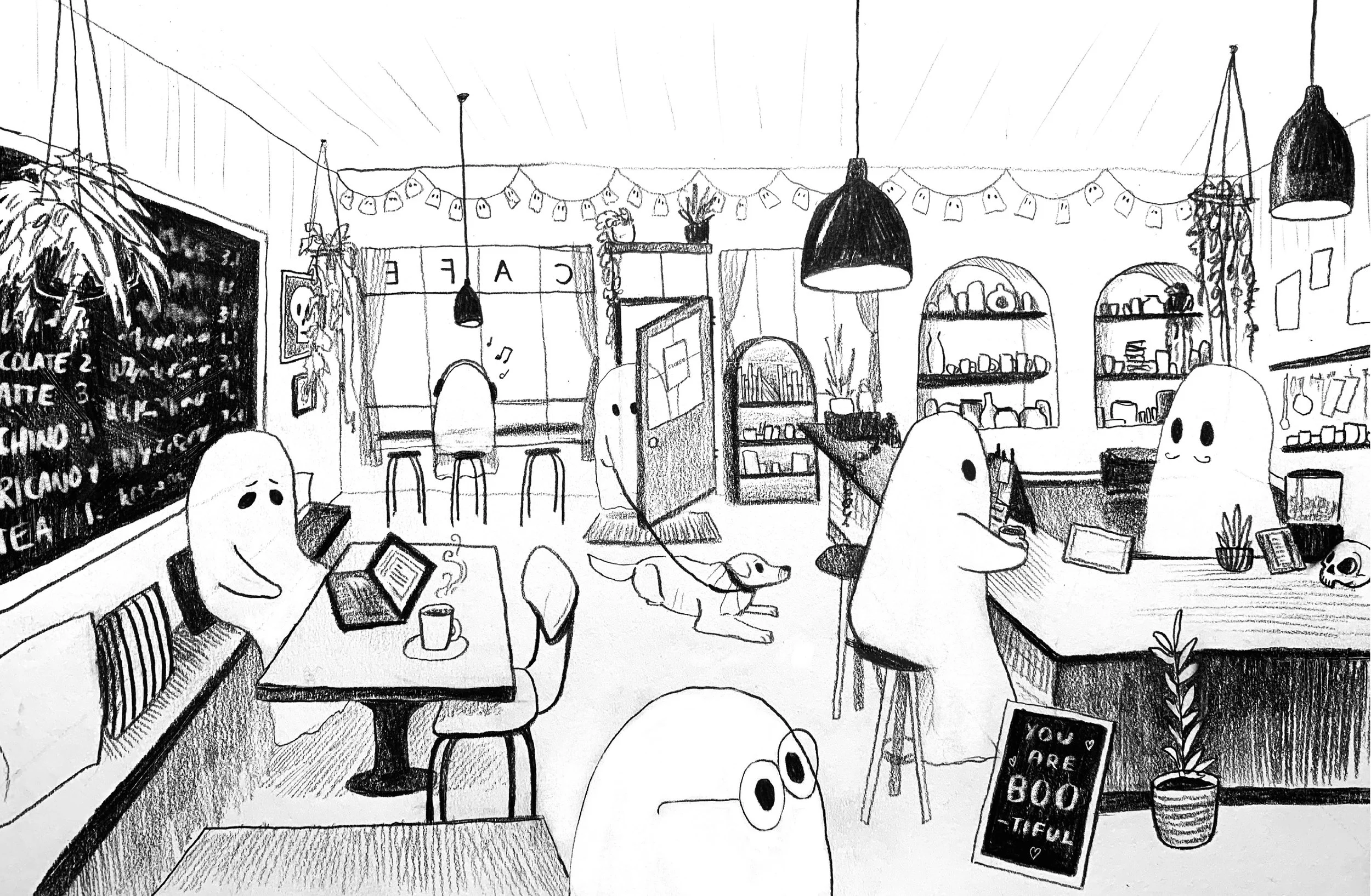 An atmospheric narrative illustration based on the concept of a cosy cafe for ghosts.