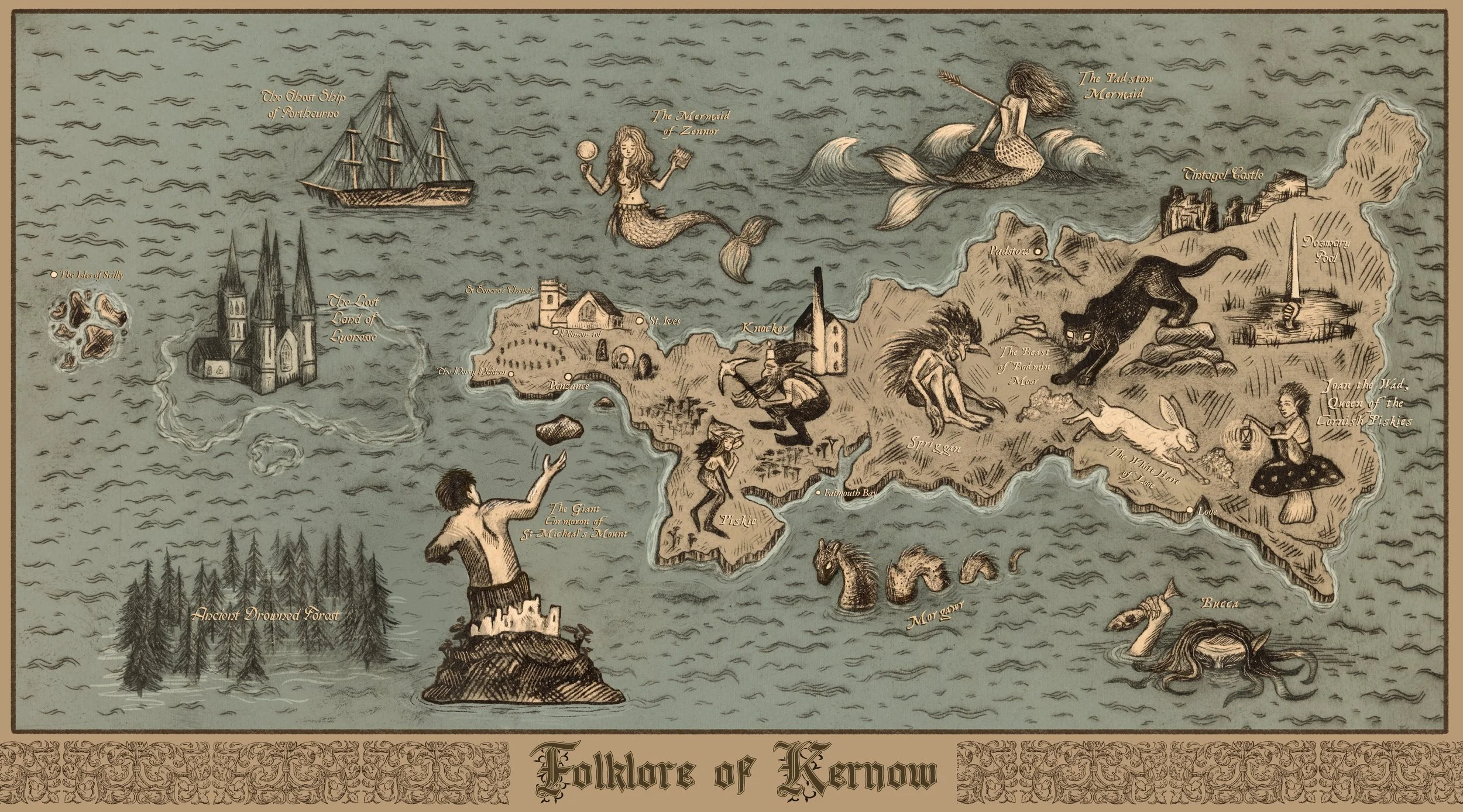 A map illustration exploring the rich folk narratives of Cornwall. I researched legendary creatures, from the Mermaid of Zennor to Morgawr, and places of legend such as the Lost Land of Lyonesse.