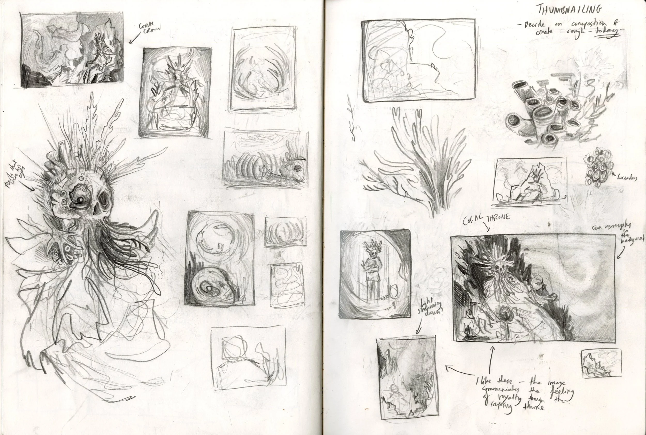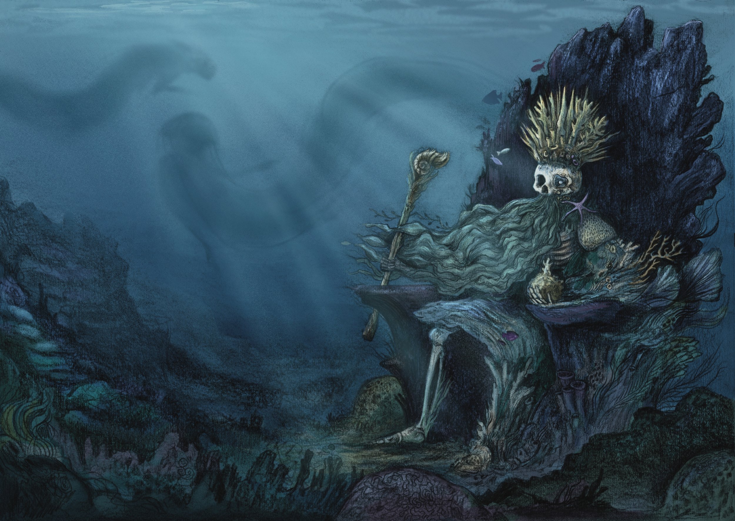A narrative illustration inspired by Ariel’s song from ‘The Tempest’, drawing upon the surreal nature of the play. Alphonso has been transformed into ‘something rich and strange’, surrounded by sea nymphs. This piece was used as the cover illustration for the programme and exhibited alongside ‘Sea Nymph’.