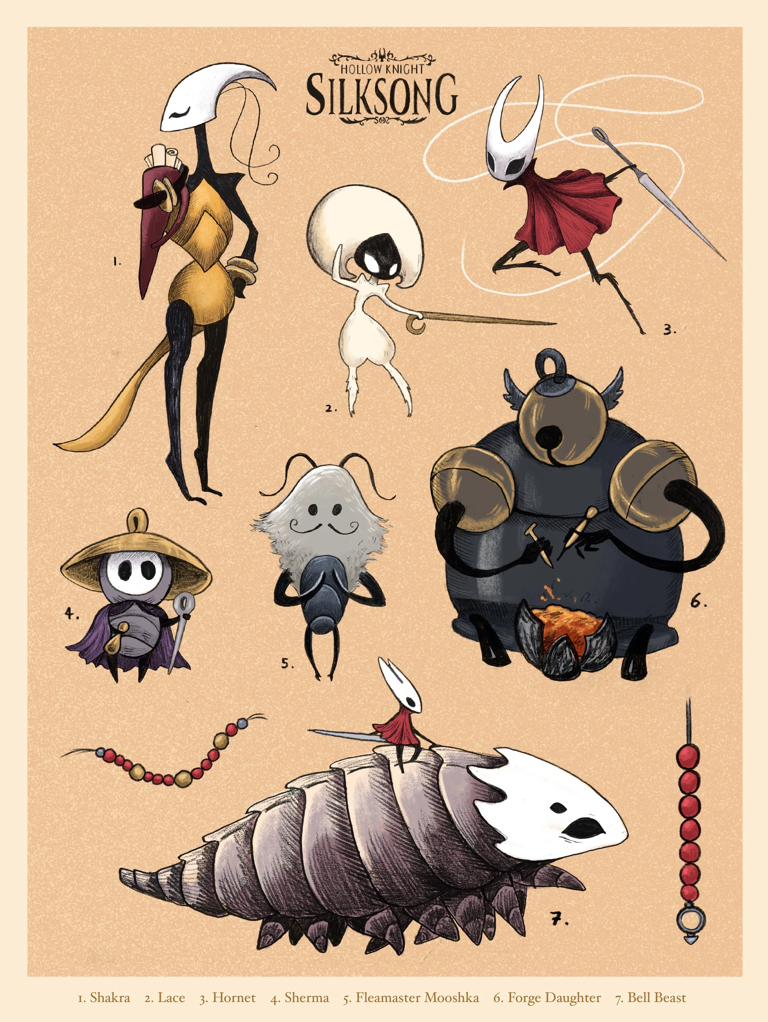 A poster design inspired by the eclectic bug characters in the game ‘Hollow Knight: Silksong’.